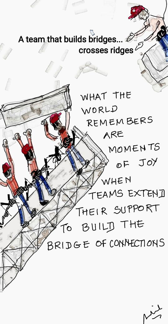 Between a team of a few sharp men and a large group of inadequate men attempting to complete the same task...the team has an edge. Deep insights, focussed targets, sharp shots, few quick moves, total concentration and killer passion mark the moves of the few sharp men. The larger collectivity of the inadequate, falls short. Shallow study, aimless moves, clumsy movements, dispersed energy and total disengagement. And what the winners recall and yearn for in the end, the most, are indeed those happy moments when the team had extended their support to each other to build their bridge of connections. The other rewards that come by drown by the sea-side and fall pale by the way-side. The team that builds bridges, crosses the ridges !!!